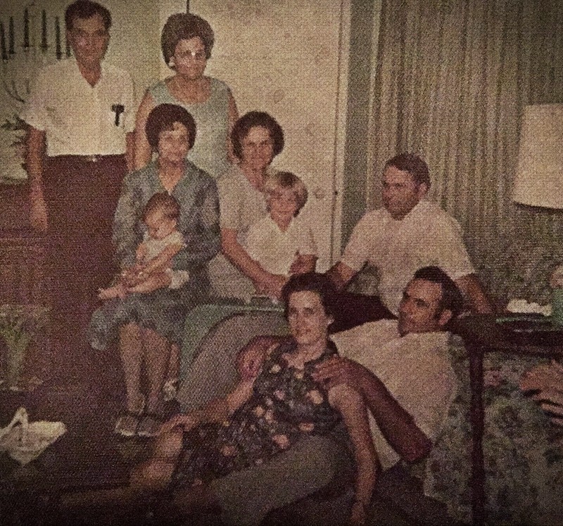 1970s photo taken in home of Irby & Birdie Burt -- Standing: John K. & French Burt Brown, middle row: Ferry Burt Dale, Ruth Burt Kilby and Vincent Burt. Front row: LaRue and Billy Burt